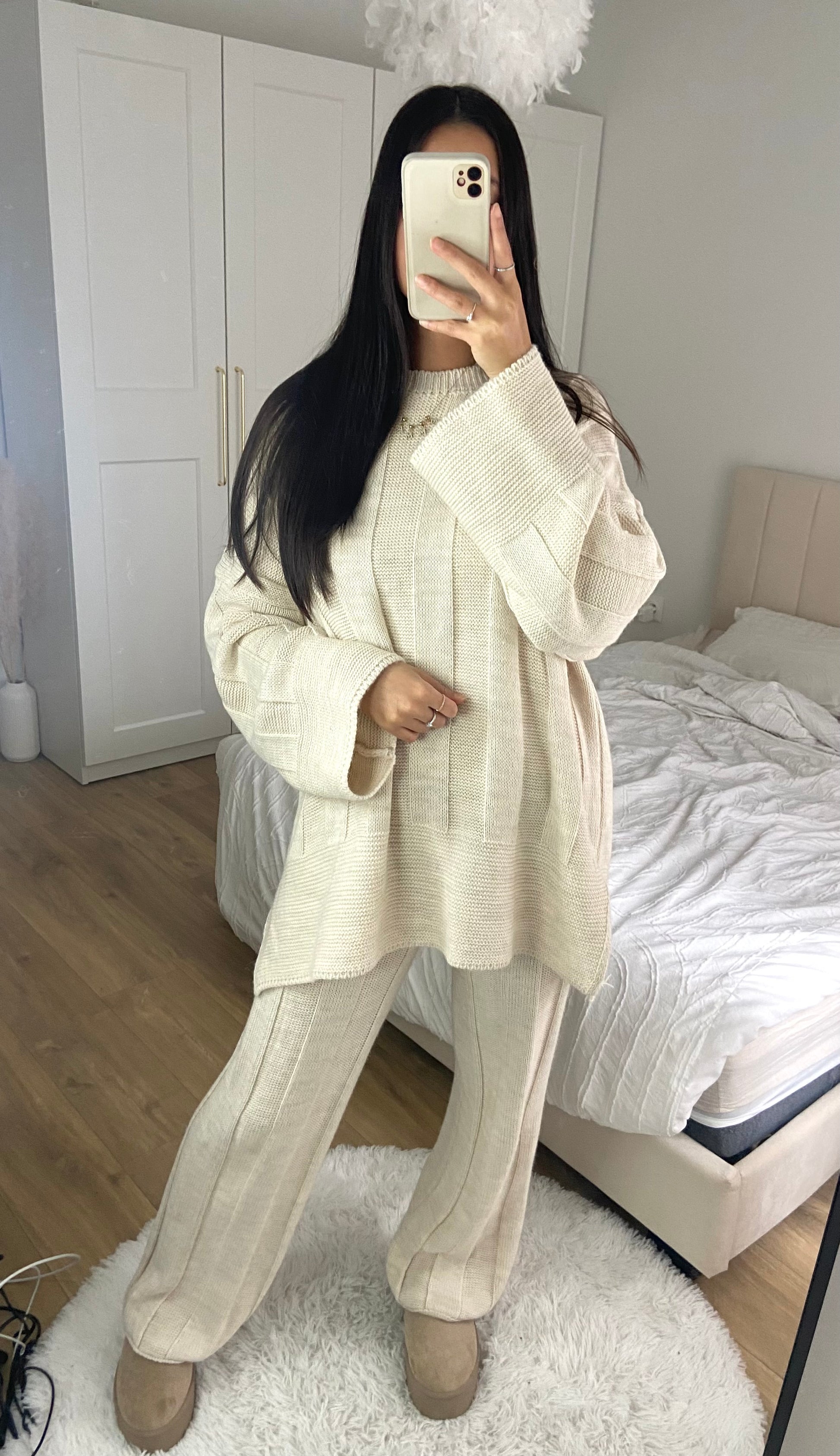 Ensemble uni à motifs grosse maille avec pull col rond avec manches longues et pantalon.